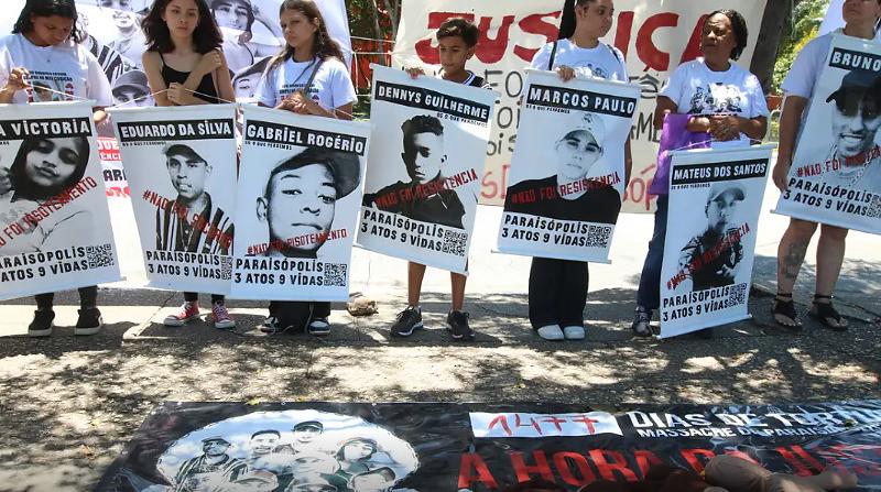 Durante a audiência, movimentos sociais realizaram um protesto em frente ao Fórum, reunindo centenas de jovens, em sua maioria negros, em apoio às famílias das vítimas.