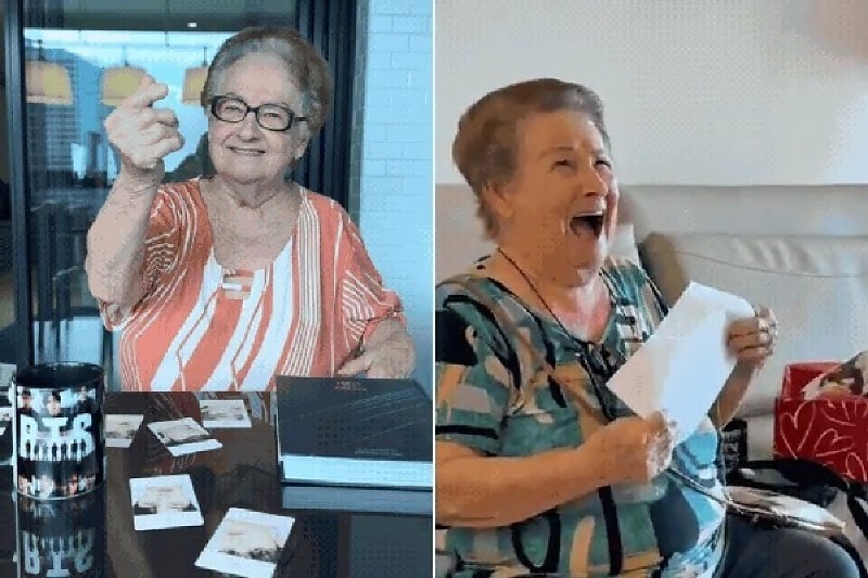 A neta preparou uma caixa com itens personalizados da banda e começou a gravação dizendo que o presente era um consolo por não ter conseguido os ingressos. "Isso aqui eu não quero, eu quero o ingresso", respondeu a avó, antes de ser surpreendida com as entradas.