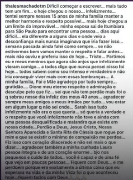 Na publicação, ele dizia estar passando por dificuldades no casamento e pediu desculpas à família e aos amigos. Ainda no documento, ele falou com respeito sobre o sogro e explicou que agiu em um momento que considerou como “o limite do improvável”.