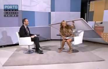 O cenário desabou em cima da apresentadora durante a realização de um programa de TV, ao vivo, nesta terça-feira (21), em Portugal. Ninguém ficou ferido. Débora Sá, apresentadora do Porto Canal, conversava com um telespectador, via telefone, quando, de repente, foi surpreendida pela madeir...