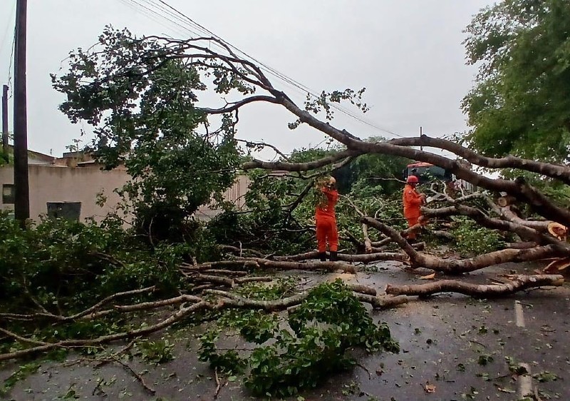 Já no Jardim Conquista, outra árvore caiu e impediu a passagem de veículos e pedestres. A remoção foi realizada com segurança pelos militares.