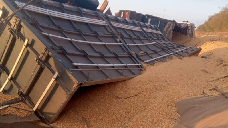 A carga de milho de uma carreta ficou espalhada depois do veículo de carga tombar às margens da BR-163, entre Sinop (479 km de Cuiabá) e Sorriso (397 km de Cuiabá), no fim da tarde desta quinta-feira (17). Apesar dos danos, ninguém se feriu no acidente.