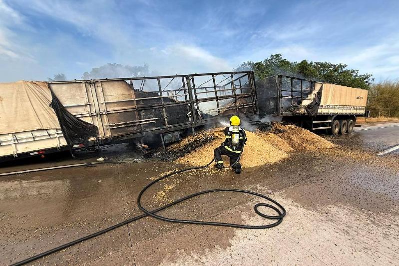 Uma carreta carregada com soja pegou fogo na manhã desta quarta-feira (15) na BR-364, em Jaciara (143 km de Cuiabá). O incêndio começou enquanto o veículo trafegava pela rodovia, mas o motorista conseguiu desengatar o cavalo mecânico, impedindo que as chamas se espalhassem e atingissem a vegetação às margens da pista.