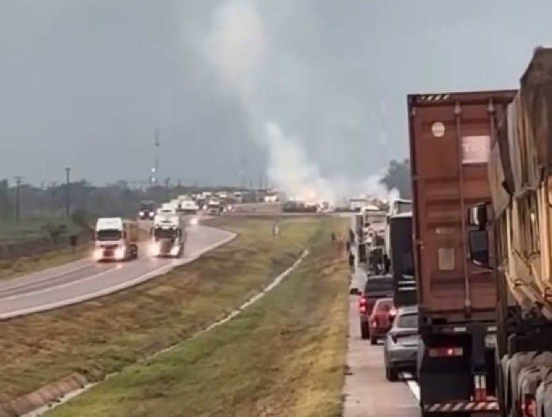Inicialmente, o tráfego no sentido sul da rodovia foi desviado para o acostamento. No entanto, o fluxo precisou ser totalmente bloqueado após parte da carga pegar fogo. Equipes do Corpo de Bombeiros e um caminhão-pipa da Nova Rota do Oeste atuaram no local para controlar as chamas e garantir a segurança viária.