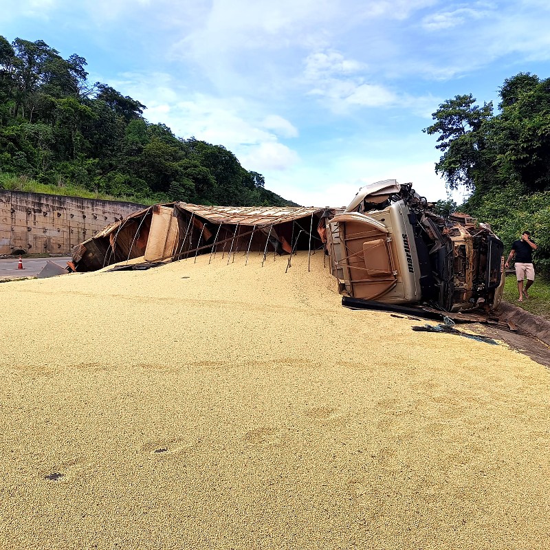 Um lado da pista foi liberado enquanto a retirada da soja continua. O trânsito está lento, mas os motoristas já conseguem avançar. Após as imediações do acidente, o tráfego volta ao normal.