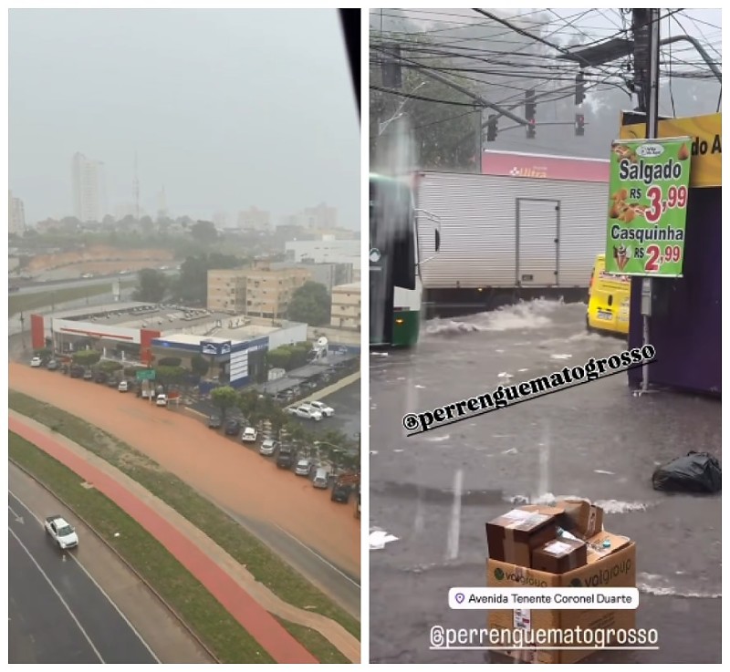 A forte chuva da tarde desta segunda-feira (17) alagou diversos pontos de Cuiabá. A região da Prainha, no Centro, ficou completamente tomada pela água. Vídeos que circulam nas redes sociais mostram motoristas enfrentando dificuldade para trafegar, enquanto a força da enxurrada arrastava lixo e entulho pelas vias.