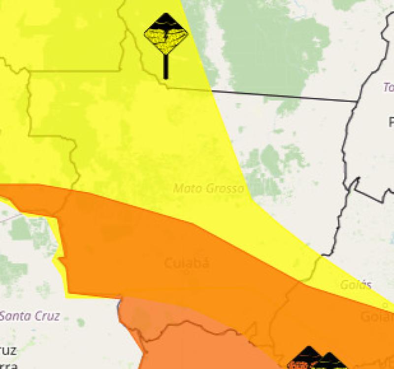 No município de Rondonópolis, também sob alerta laranja do Inmet, a temperatura pode chegar à casa dos 37 °C ainda no fim desta manhã. À tarde, o tempo fecha e pode haver pancadas de chuva intensa.