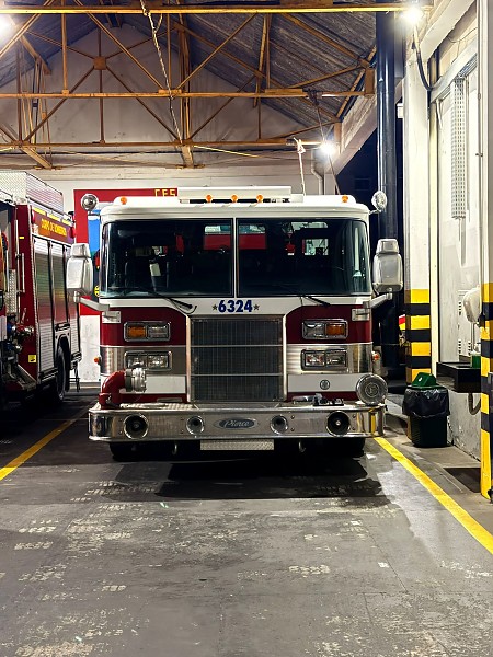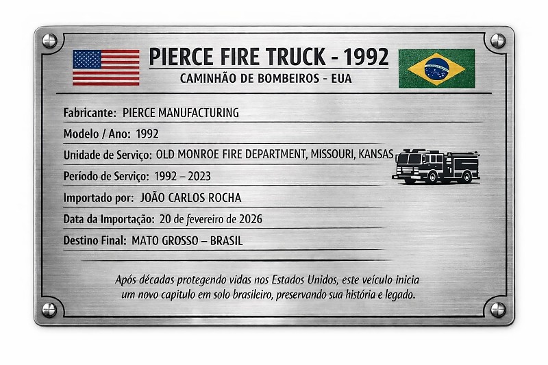 O modelo Pierce Fire Truck foi fabricado em 1992 pela empresa americana Pierce Manufacturing. O veículo atuou por 31 anos no Corpo de Bombeiros dos Estados Unidos, informação registrada na placa de documentação do caminhão.