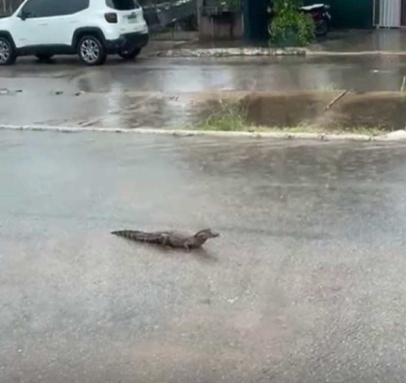 Um pequeno jacaré foi visto passeando pelo bairro Cristo Rei em Várzea Grande. As ruas do local estavam alagadas devido à chuva intensa que começou na madrugada e durou quase a manhã toda desta quinta-feira (26). O mau tempo causou diversos transtornos a todos os moradores de Cuiabá e Várzea Grande.