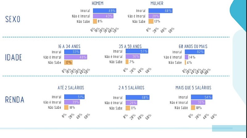 Já entre idosos, o cenário é oposto: 82% classificam o uso como imoral, indicando forte resistência nas faixas etárias mais altas.