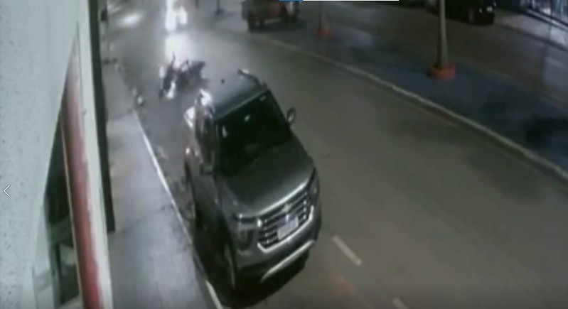 As imagens registram a moto Yamaha/MT-03 preta ultrapassar um Corolla branco antes de se desequilibrar, fazendo o condutor ser arrastado pela rua até ficar preso embaixo da camionete Montana que estava estacionada em frente à ótica Pura Visão.