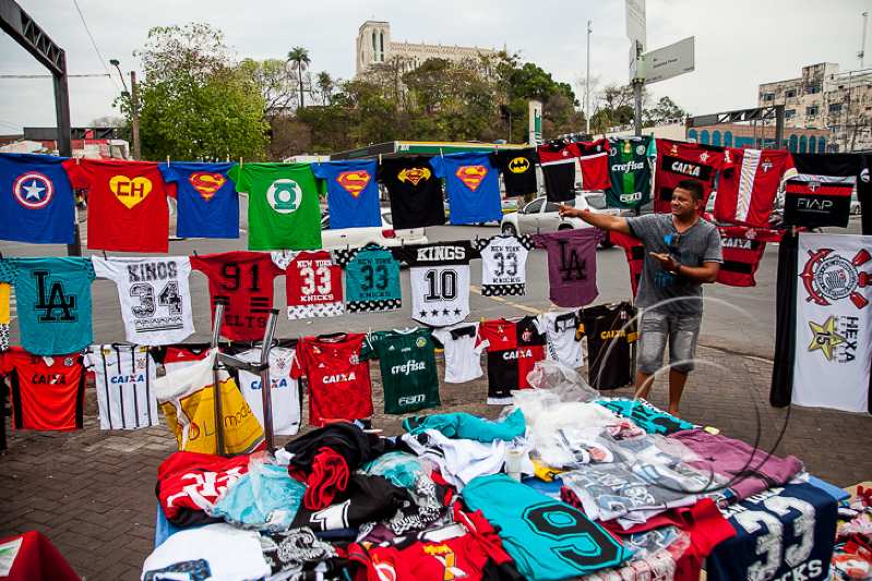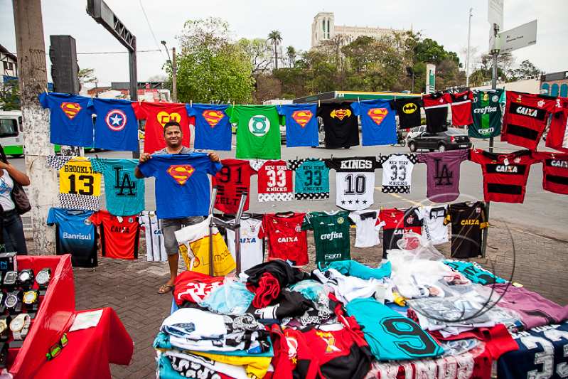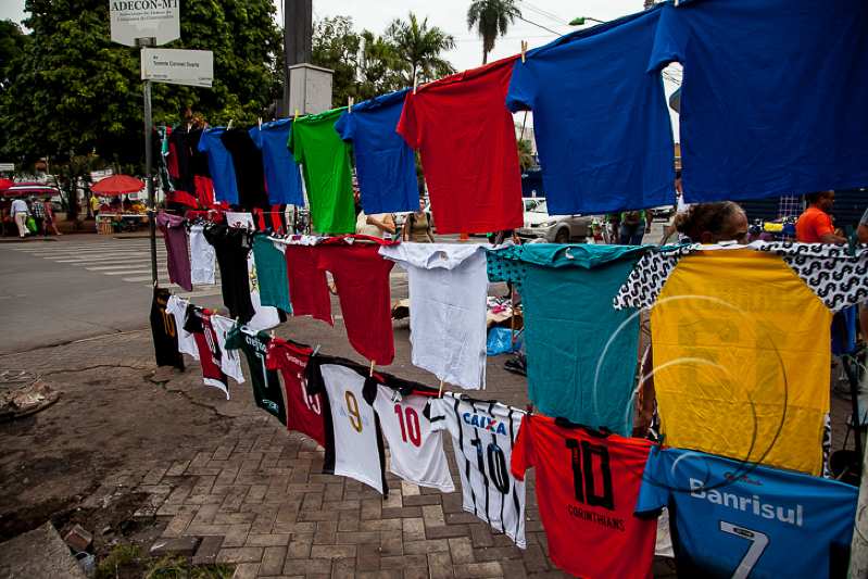 Seu ponto é fixo. As camisas de clubes de futebol e de super-heróis ficam no varal e todos que passam procuram sobre preço e qualidade. “Vendo de tudo. Em dia de jogo levo minhas camisas para a Arena (Pantanal). Meu emprego, meu pão e de minha família eu tiro aqui”, garantiu o rapaz.