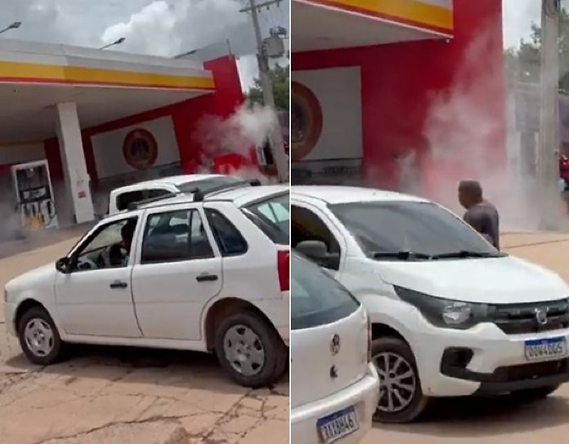 Um flagrante do momento mostra a correria que se formou no posto. Dois funcionários, munidos com extintor de incêndio, apagaram as chamas e a fumaça do equipamento se espalhou pelos posto assustando os clientes.