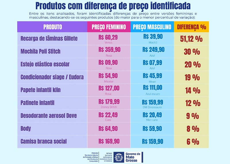 Em ação de monitoramento de preços, a Secretaria Adjunta de Proteção e Defesa dos Direitos do Consumidor (Procon-MT), vinculada à Secretaria de Assistência Social e Cidadania (Setasc), identificou diferenças de até 50% no valor de produtos equivalentes destinados ao público feminino e masculino.