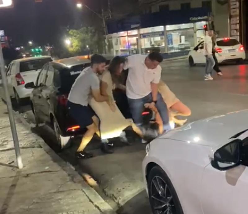 Populares registraram uma briga generalizada ocorrida na madrugada desta segunda-feira (31), próximo à Valley Pub, na avenida Isaac Póvoas, em Cuiabá. No vídeo, é possível ver três mulheres se estapeando no meio da via, enquanto dois homens tentam separar a briga. A polícia disse que não houve registro da ocorrência.