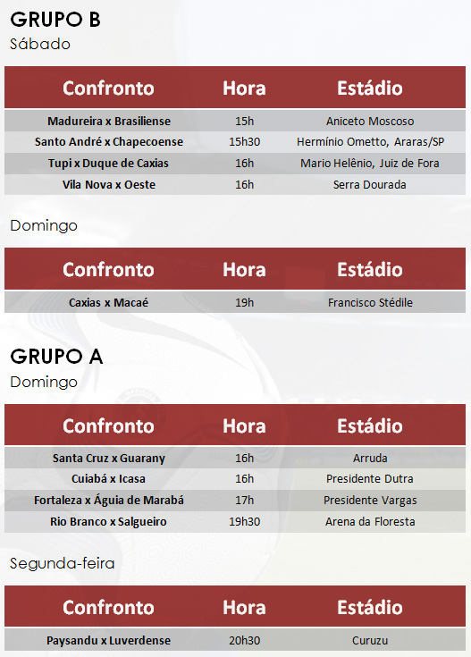 A tabela divulgada pela entidade mantém os confrontos anunciados no dia 26 de março, apenas com a revisão das datas. Os jogos da primeira rodada acontecerão entre estes sábado, domingo e segunda-feira.