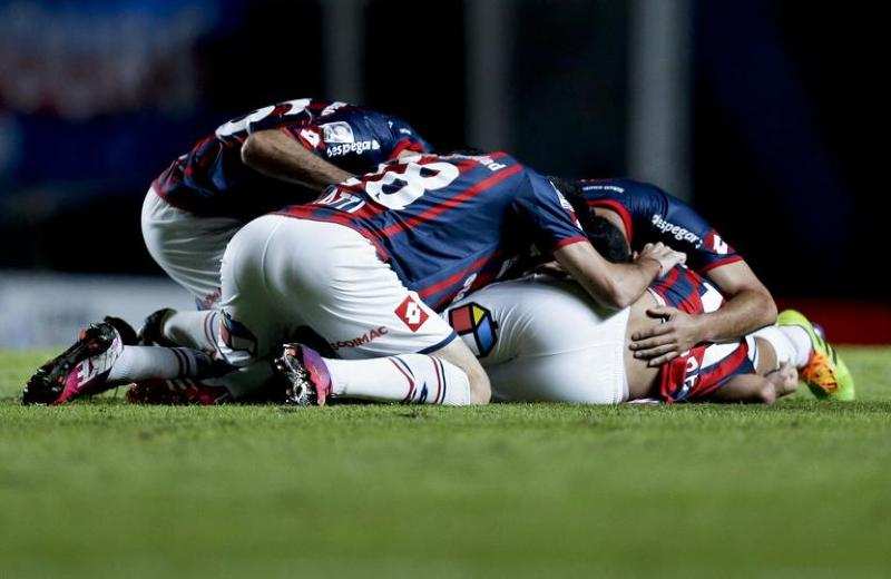 AFI Jogadores do San Lorenzo faazem o 'montinho' com o terceiro gol contra oo BOta