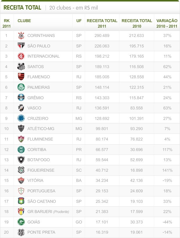 Pelo terceiro ano consecutivo, o Corinthians é o clube com maior receita financeira do Brasil. Chegou a R$ 290 milhões arrecadados em 2011, um salto de 37% em relação a 2010. E aumentou sua vantagem sobre o segundo colocado, o São Paulo, que acumulou R$ 226 milhões, e o terceiro, o Inter, que teve R$ 198 milhões. O Santos, que aumentou em 62% a sua receita, ganhou duas posições e está em quarto lugar, com R$ R$ 189 milhões.