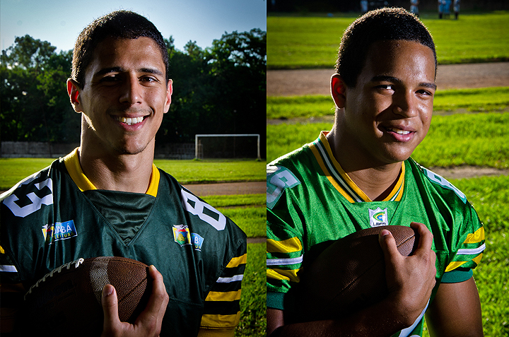 Para o Heron, que é quarterback de origem (jogador de ataque), pratica o esporte desde 2004 e já conquistou 3 títulos pela capital. A expectativa é grande para o início do campeonato, tendo em vista o nível forte das outras que virão. "Queremos começar com o pé direito, mas pra isso temos que trabalhar forte. Temos pela frente equipes de tradição e que esse ano estão muito mais forte, com isso vamos mostrar pra eles que temos condições de chegar e fazer bonito em nome de Cuiabá", disse o atleta. Hugo Dias/HiperNotícias Heron (esquerda) e Wesley são os primeiros reforços do Cuiabá Arsenal para a competição nacional