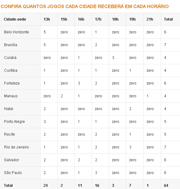 De acordo com a tabela do Mundial de 2014, 24 dos 64 jogos da Copa estão marcados para as 13h. O horário é o que mais concentra partidas. Cerca de 37% dos jogos da Copa acontecerão nesta hora. Para as 16h, por exemplo, estão marcados 17% das partidas.