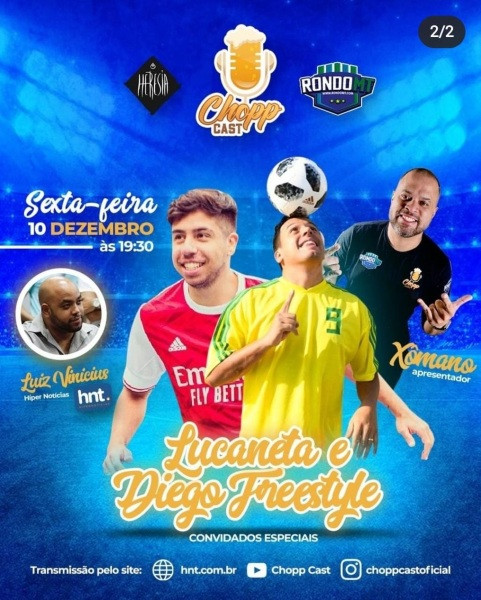 O HiperNotícias inicia nesta sexta-feira (10) uma parceria com a página de podcast “ChoppCastOficial”. Com muito chopp, futebol e resenha, trará no “Hiper Chopp Cast” entrevistas exclusivas com jogadores, ex-atletas e influenciadores do mundo da bola. Neste primeiro encontro, já inicia com um bate-papo com as atrações nacionais Lucaneta e Diego Freestyle.