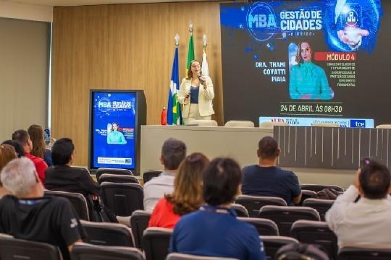 A professora doutora Thami Covatti Piaia apontou caminhos para que gestores públicos possam conciliar a coleta de dados com a proteção da privacidade durante o 4º módulo do MBA em Gestão de Cidades do Tribunal de Contas de Mato Grosso (TCE-MT). A aula foi realizada nesta sexta-feira (24), na Escola Superior de Contas.