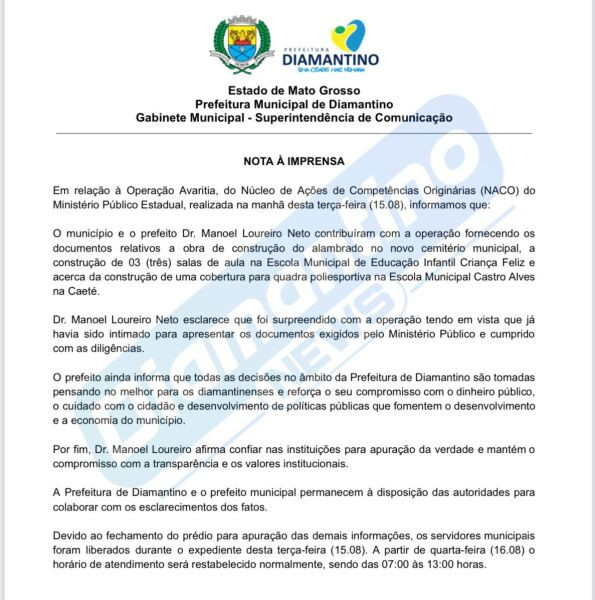 O prefeito Manoel Loureiro Neto (MDB) emitiu nota afirmando que recebeu com 'surpresa' a 'Operação Avaritia', do Ministério Público de Mato Grosso, deflagrada nesta terça-feira (15), em Diamantino (183 km de Cuiabá). De acordo com o posicionamento divulgado pelo prefeito, os documentos requisitados pelo órgão ministerial já haviam sido entregues espontâneamente às autoridades.