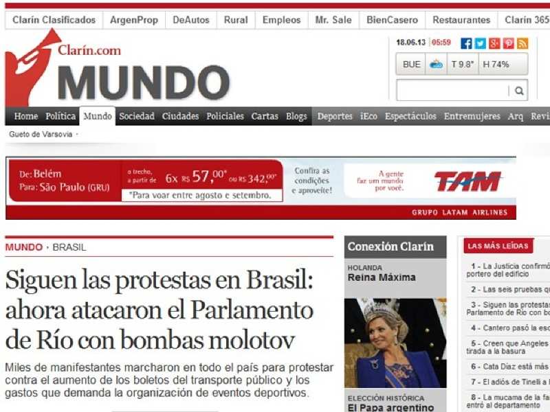 No argentino “El Clarín”, o destaque é para as bombas incendiárias lançadas contra a Assembleia Legislativa do Rio.