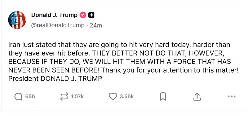 "O Irã acaba de declarar que vai atacar com muita força hoje, mais forte do que jamais atacou antes. É melhor que não façam isso, porque se fizerem, nós os atingiremos com uma força nunca vista antes!" , disse Trump.