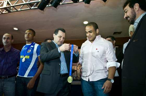| Silval prepara medalha do Mérito Esportivo para dependurar no pescoço de Rafael Feijão, ao lado de Chico Daltro, pai da ideia |