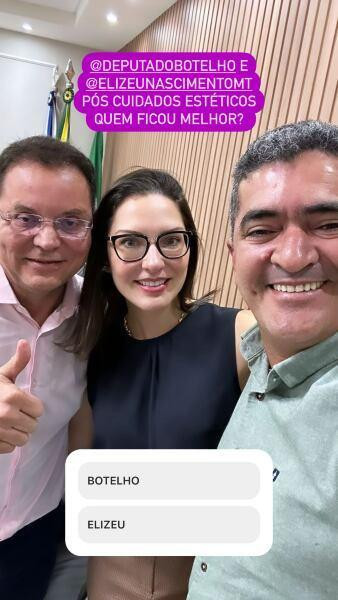 Quem ficou melhor após os procedimento estéticos: Eduardo Botelho (UB) ou Elizeu Nascimento (PL)? Essa foi a pergunta de uma enquete nos stories da vice-presidente da Assembleia Legislativa (ALMT), deputada Janaina Riva (MDB), que agitou o Instagram nesta segunda-feira (12). A brincadeira mobilizou torcidas simpatizantes aos políticos.