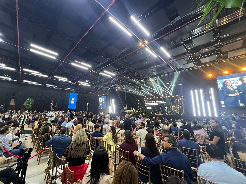 O Allure Hall, em Cuiabá, atingiu sua lotação máxima para a cerimônia de transmissão de faixa do ex-governador Mauro Mendes (União Brasil) ao governador Otaviano Pivetta (Republicanos). O salão estava cheio de convidados antes mesmo do início da solenidade. O ato ocorre após a assinatura do termo de posse de Pivetta na Assembleia Legislativa (ALMT) e entrega da carta de renúncia de Mendes ao presidente da Casa de Leis, Max Russi (Podemos).
