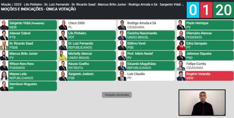 O vereador por Cuiabá, Rogério Varanda (MDB), protagonizou um episódio inusitado na sessão desta terça-feira (1º). O emedebista deixou o controle de votação no bolso e acabou apertando "sem querer" o botão de "não" ficando contra sua indicação de moção de aplausos aos psicólogos hospitalares, obrigando a mesa diretora a anular o pedido. A situação incomum arrancou risos do Sargento Vidal (MDB), que presidia a sessão.