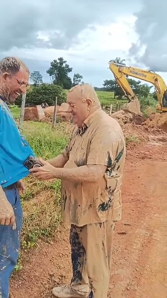 Acostumado a acompanhar obras de estradas na região, o vereador Tuti levou um banho de lama enquanto gravava um vídeo próximo à execução de um serviço. Durante o registro, uma pedra caiu em uma área enlameada e provocou um grande respingo, atingindo o parlamentar em cheio.