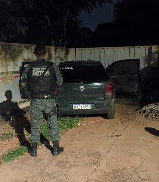 Quatro suspeitos abandonaram um carro com registro de roubo e fugiram por uma área de mata ao perceberem a aproximação da Polícia Militar, na madrugada desta quinta-feira (23), em Várzea Grande.