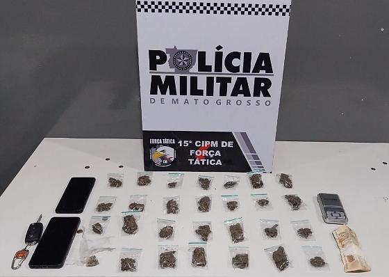 No total foram apreendidos 28 porções análogas à maconha, três celulares e demais materiais. Diante aos fatos, o suspeito foi conduzido à Central de Flagrantes para as devidas providências cabíveis.