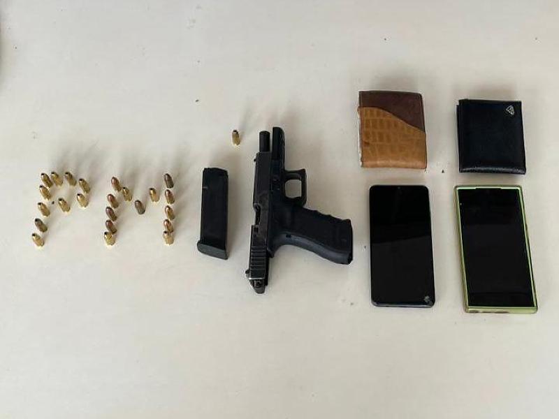 Durante a revista, os policiais encontraram uma pistola carregada com 18 munições e outras seis no bolso do suspeito. Também foram apreendidos celulares, um relógio e uma máscara tipo balaclava.
