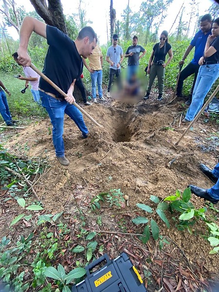 Com a possível localização do corpo, os policiais foram até o local e, após escavarem, conseguiram encontrar o corpo enterrado em uma cova rasa, em uma região de mata do município.