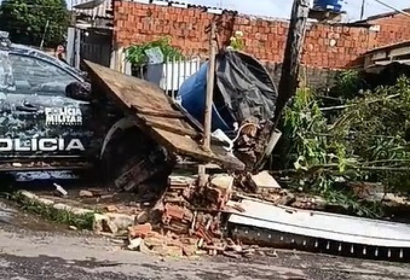 Uma viatura da Rotam derrubou o muro de uma residência na tarde desta segunda-feira (23), no bairro Novo Mato Grosso, em Cuiabá. O veículo colidiu contra a parede da casa durante uma perseguição a um homem de 29 anos, que acabou preso. O suspeito foi autuado por direção perigosa, resistência, desobediência e tráfico de drogas. (VEJA O VÍDEO AO FINAL)