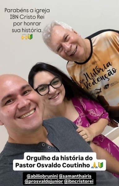 Na tarde desta quarta-feira (22), o prefeito Abílio Brunini publicou uma foto no instagram, ao lado de Osvaldo Coutinho e da vereadora Samantha Íris (PL), esposa do prefeito, com os textos sobrepostos: “Orgulho da história” e “Parabéns à Igreja IBN por honrar sua história”.
