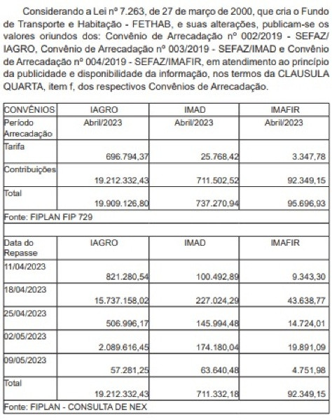 As portarias da Sefaz apotam que a Agência Estadual de Defesa Sanitária Animal e Vegetal (Iagro-MT), o Instituto da Madeira do Estado de Mato Grosso (Imad-MT) e do Instituto Mato-grossense do Feijão, Pulses, Grãos Especiais e Irrigação (Imafir-MT) concentraram a coleta de R$ 20.742.094,67. Já o Fethab Óleo Diesel arrecadou R$ 60.582.690,00.