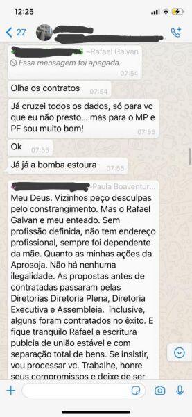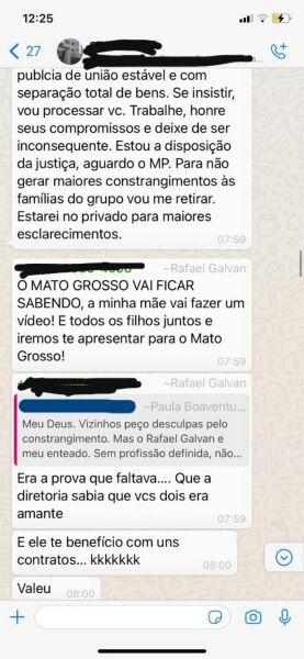 “Quanto as minhas ações da Aprosoja, não há nenhuma ilegalidade. As propostas antes de contratadas passaram pelas diretorias Plena, Executiva e Assembleia. Inclusive, alguns foram contratados no êxito. E fique tranquilo Rafael a escritura pública de união estável é com separação total de bens. Se insistir, vou processar você. Trabalhe, honre seus compromissos e deixe de ser inconsequente”, escreveu a advogada.