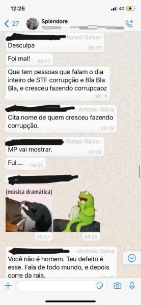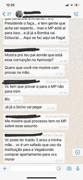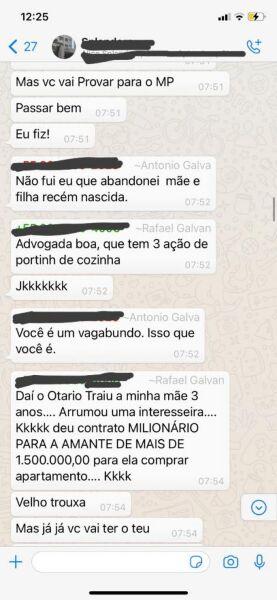 Antônio Galvan entrou na conversa e saiu em defesa de sua esposa – que segundo seu filho teria sido sua amante -, e pediu que Rafael provasse o que estava dizendo. Rafael afirmou que a situação iria “estourar” e que o pai teria que provar inocência ao Ministério Público.
