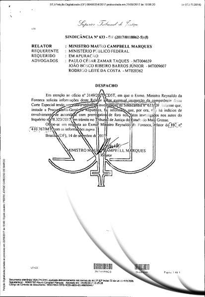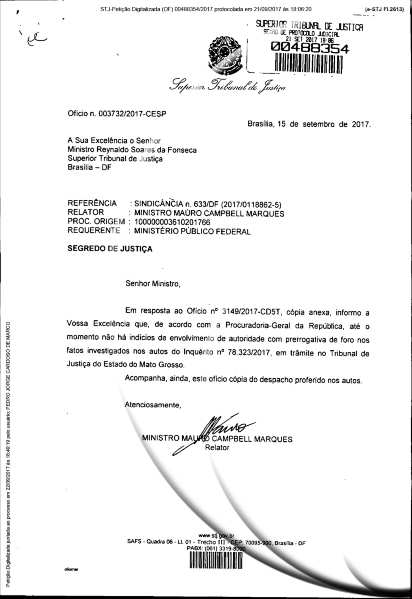 "Em resposta ao ofício nº 3149/2017 CD5T, cópia anexa, informo a Vossa Excelência, que de acordo com Procuradoria-Geral da República, até o momento não há indícios de envolvimento de autoridade com prerrogativa de foro nos fatos investigados nos autos do Inquérito nº 78323/2017, em trâmite no Tribunal de Justiça do Estado de Mato Grosso.", diz o ofício assinado por Campbell no último dia 15 de setembro.
