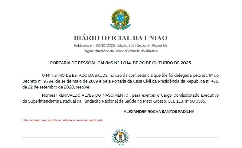 O ex-vereador por Cuiabá, Renivaldo Nascimento (PSDB), foi nomeado superintendente da Fundação Nacional de Saúde (Funasa) em Mato Grosso. A nomeação foi oficializada pelo ministro da Saúde, Alexandre Padilha (PT-SP), e publicada no Diário Oficial da União desta terça-feira (28). A indicação partiu do deputado federal Emanuelzinho (MDB), com o aval do ex-prefeito Emanuel Pinheiro (PSD) e do ministro da Agricultura e Pecuária, Carlos Fávaro (PSD).