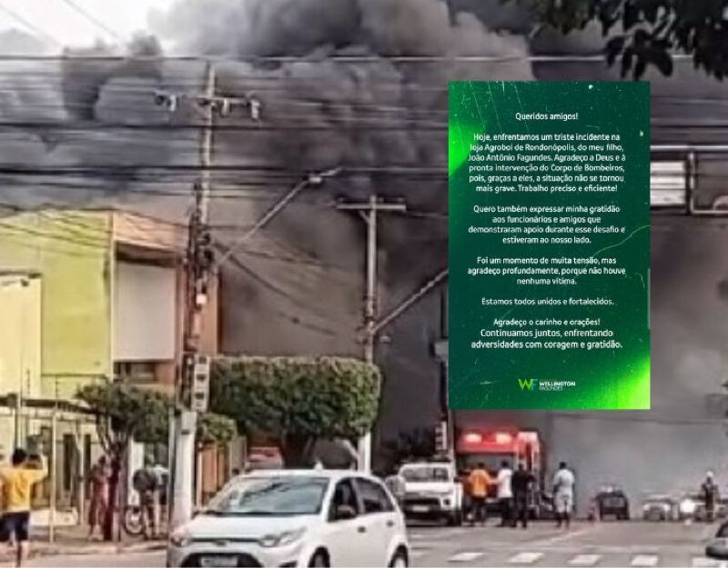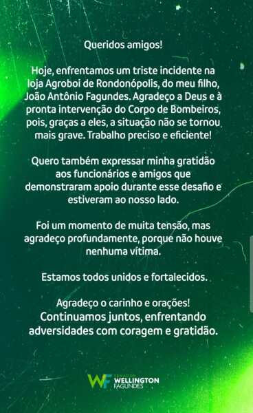 "Hoje, enfrentamos um triste incidente na loja Agroboi de Rondonópolis, do meu filho, João Antônio Fagundes. Agradeço a Deus e à pronta intervenção do Corpo de Bombeiros, pois, graças a eles, a situação não se tornou mais grave. Trabalho preciso e eficiente!", escreveu Wellington Fagundes.