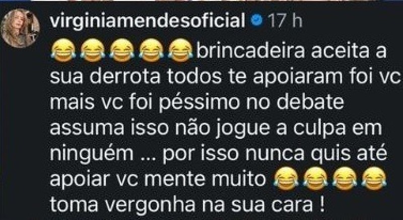 "Brincadeira. Aceita a sua derrota. Todos o apoiaram. Você foi péssimo no debate, assuma isso e não jogue a culpa em ninguém", registrou Virginia Mendes no perfil do site Olhar Direto nesta sexta-feira (17).