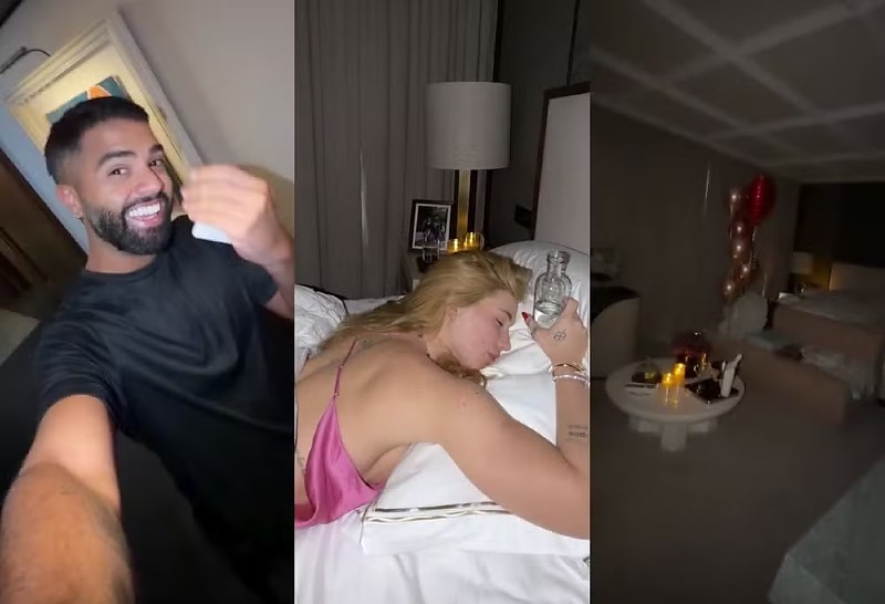 A gravação, publicada nas redes sociais, mostrou uma decoração romântica no ambiente, com balões em formato de coração, velas, flores e porta-retrato com foto do casal.