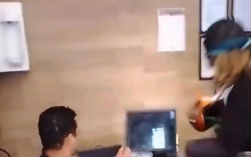 Na sequência, o entregador usa o capacete que já estava em suas mãos para dar dois golpes em computadores que estão sobre uma mesa. Neste momento, ao ser contido por outros funcionários, ele repete: "Ele está me devendo, mano".
