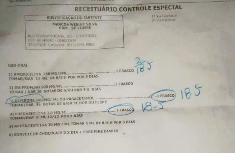 Sorvete de chocolate e "Free Fire", um jogo de ação disponível no celular, foram receitados para uma criança com sintomas gripais junto com uma lista de remédios como amoxilina e dipirona.